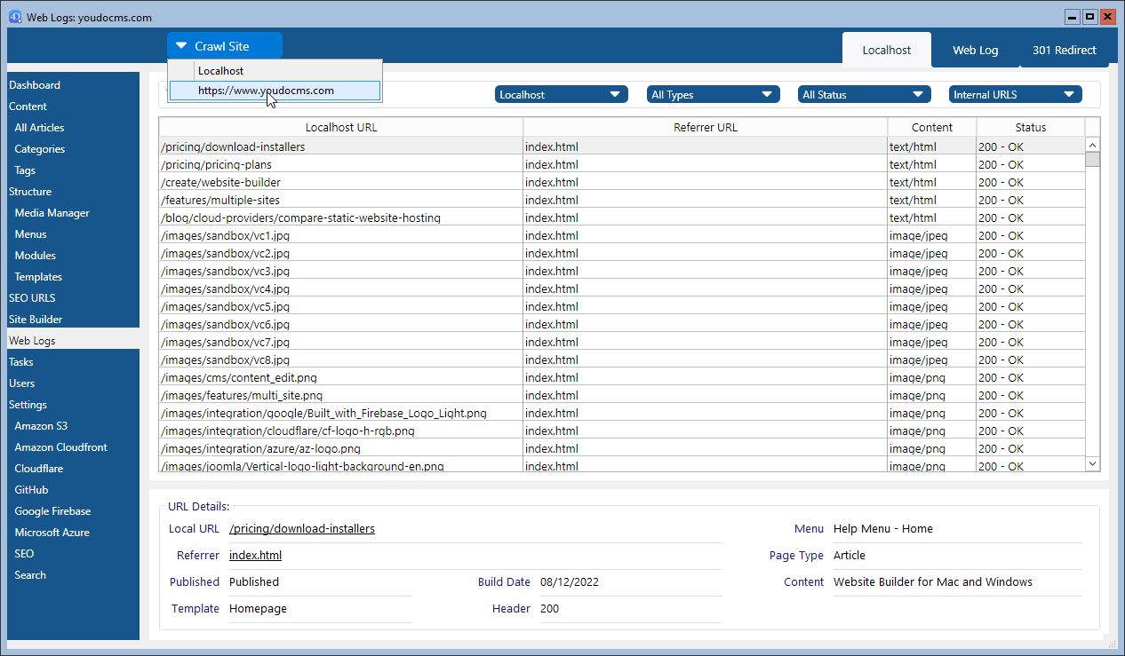 Checking external links to third party site is essential to SEO. Crawl a website instantly and find broken links (404s) and server errors. YouDoCMS web crawler connects the crawl results to the site URL database for internal and external URLs.