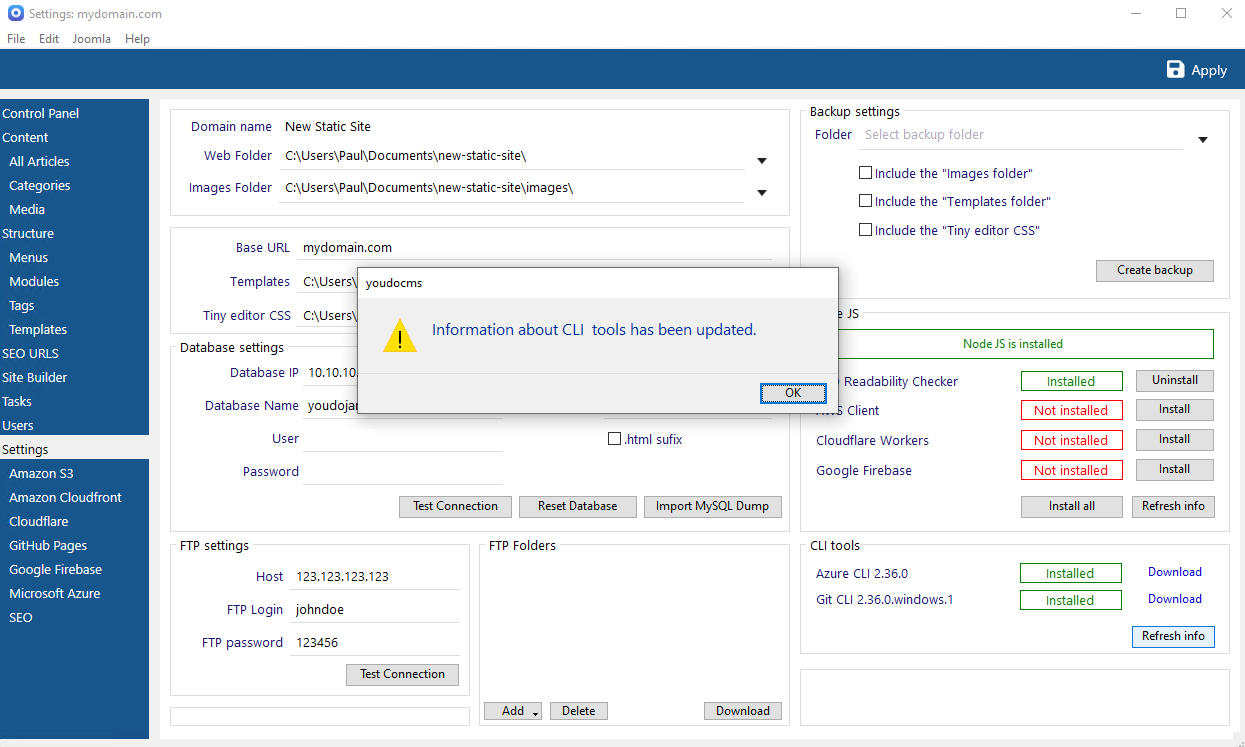 If Node is installed this can be used to install packages via a single click for SEO readability, AWS, CloudFlare and Google Firebase. Use the refresh info button to update YouDoCMS and make these packages available to our application.