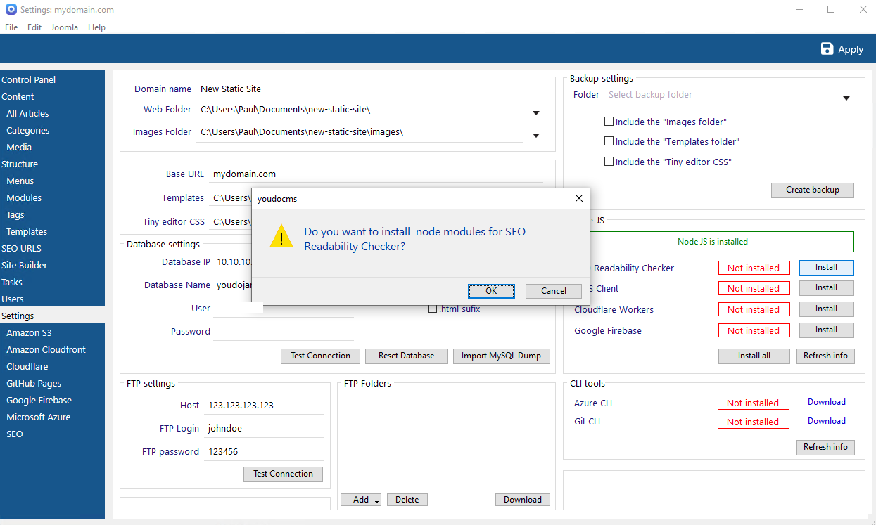 Node packages are installed locally to YouDoCMS and are available to all domains. Therefore this process only needs to be carried out once. Different sites can use different providers. All login and password information is stored locally on your computer only.