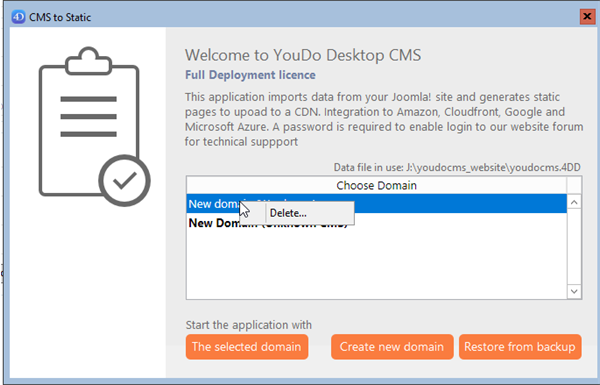 Each website requires individual settings to store the templates and site content on your local computer. To create another new website or switch to a project from the File menu choose File - Switch Domain which will display the splash screen and enable you to select a different site. To delete a site you can access the splash screen and right click the site provided this is not the current active site. The current active site is the one highlighted in bold.