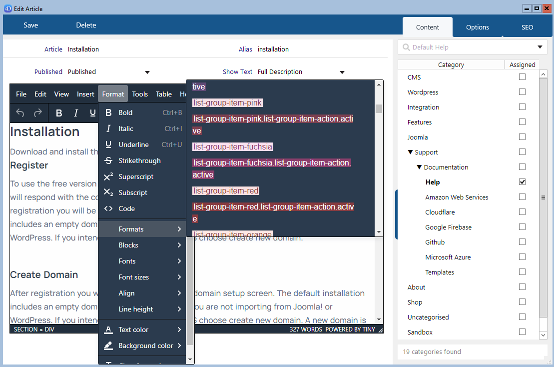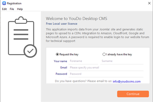 To use the free version of the software you need to register with your email address. Our server will respond with the code sent to your email. Enter the code and this will enable software. After registration you will be presented with the domain setup screen. The default installation includes an empty domain which you can use if you are not importing from Joomla! or WordPress. If you intend to import from your CMS choose create new domain.