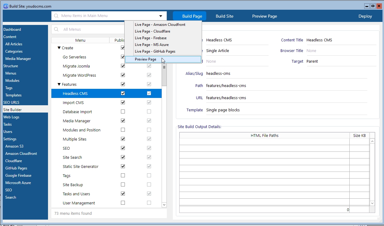 After setting up the file paths for an example websites and saving using the "Apply" button navigate to the site builder page. From the build site button choose local preview and this will build the site and create the HTML files in the WebFolder. The list of processed files is displayed on the screen. Click on a file and this will open your local browser display the page.