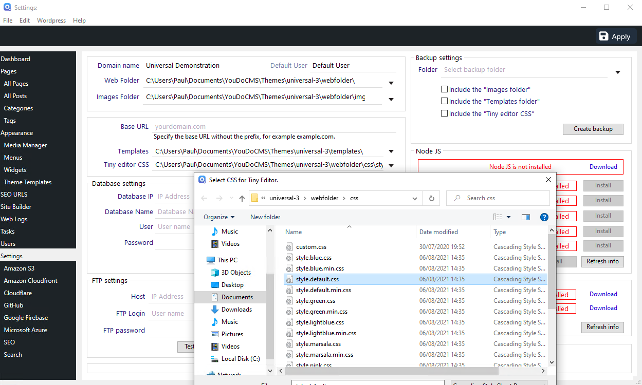 A new domain is created matching the content management system of your choice. The domain settings page is displayed to set up your site. Each website you create requires a default root folder on your local computer to store the files prior to uploading to the cloud. By defualt the root folder is in the user documents folder.