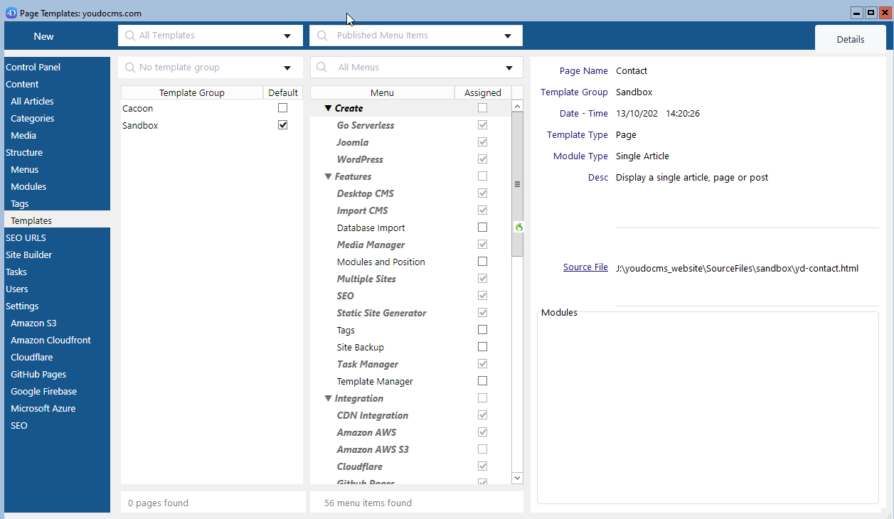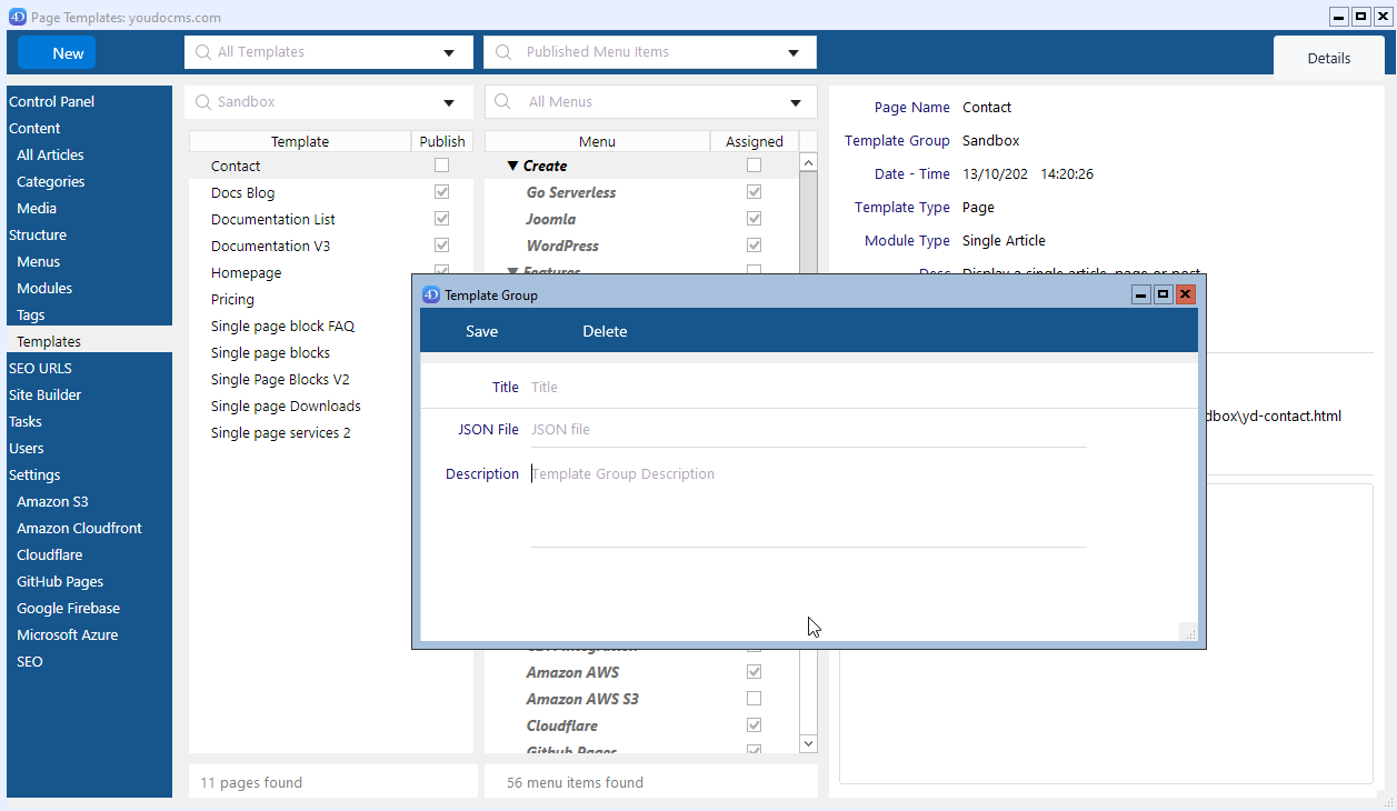 Content management system such as Joomla! and WordPress use templates/themes to display different types of pages. For example individual pages for single articles, pages or posts or list pages for categories to display lists of content with links to the single page. A YouDoCMS template group is a collection of templates that are assigned to different pages in a website. Template groups enable switching between different styles similar to choosing a different template within Joomla! or WordPress theme. Navigate to templates and create your first template group from the New button. Name the group and save. Ignore JSON file.