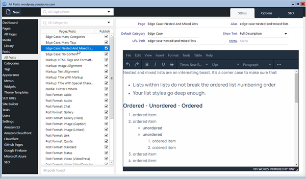 The imported content should have the same relations to menus and widgets as the original WordPress site.. Posts should be allocated to the same categories and tags should be related to the same posts and categories. WordPress pages should have the same hierarchical structure as the original WordPress site. YouDoCMS has an additional option for a default category where an post belongs more than one. Every post must have a default category this is displayed at the top of the category list when editing. To edit a page, post, category or tag double click to open the edit window. YouDoCMS uses TinyMCE which was the original WordPress editor until until the recent introduction of the block editor.
