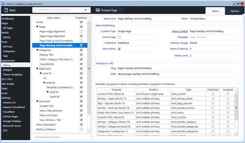 Menus retain their status published, unpublished, trashed etc. and each menu can be re-organised using drag-and-drop. YouDoCMS menu manager is slightly different to WordPress in that you create a new menu then chooses the type i.e page post or category.